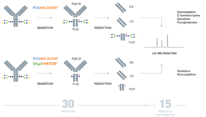 Figure 1: Workflow overview. mAbs are digested with FabRICATOR and disulfide bonds are reduced to yield subunits suitable for LC-MS analysis of many different critical quality attributes (top). To remove the heterogeneity caused by the Fc glycosylation, the GlycINATOR endoglycosidase can be added to the same reaction (bottom).