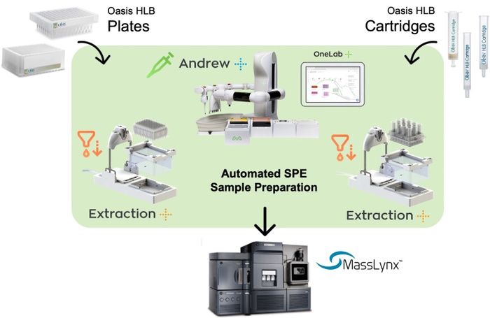 Figure 1: Graphical illustration of the automated SPE sample preparation and LC-MS analysis workflow using Oasis HLB SPE plates and cartridges and the Andrew+ Pipetting Robot configured with the Extraction+ connected device.