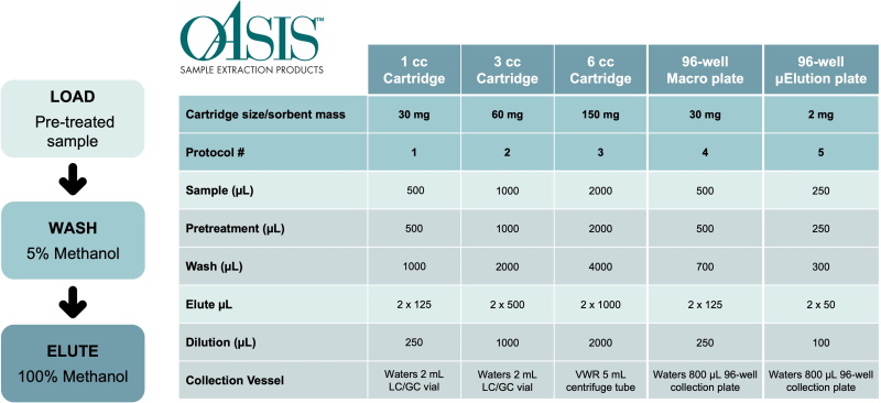 Provided herein, are generic protocols for the reversed-phase SPE extraction of target analytes using Waters Oasis HLB 1, 3, and 6cc cartridges as well as macro and μElution 96-well plates. Protocols follow a simple 3-step SPE procedure (load, wash, elute).