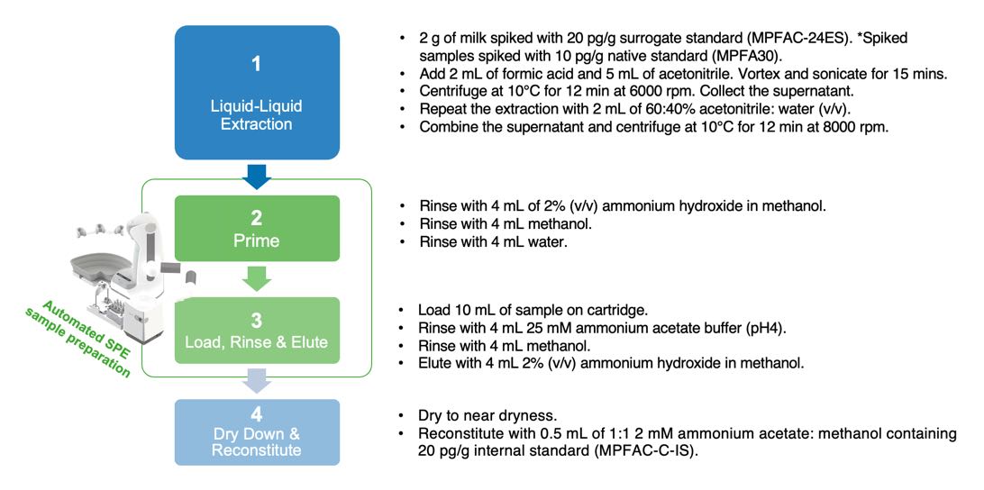 Preparing milk samples for analysis using an LC-MS/MS involves a 4-part workflow requiring many pipetting tasks and is a time-consuming process. It is, therefore, desirable to automate as many parts of the workflow as possible to improve throughput and reduce human experimental errors. The protocol shown here automates the priming of OASIS WAX cartridges, loading, rinsing, and eluting the sample, thus improving experimental efficiency while reducing errors.