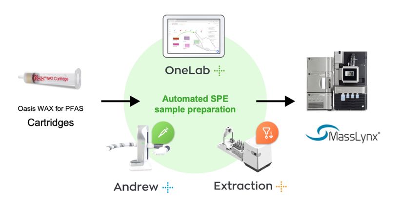 Figure 2: Graphical illustration of the automated SPE sample extraction and LC-MS analysis workflow using the Oasis WAX for PFAS 6 cc cartridges on the Andrew+ Pipetting Robot configured with the Extraction+ Connected Device.