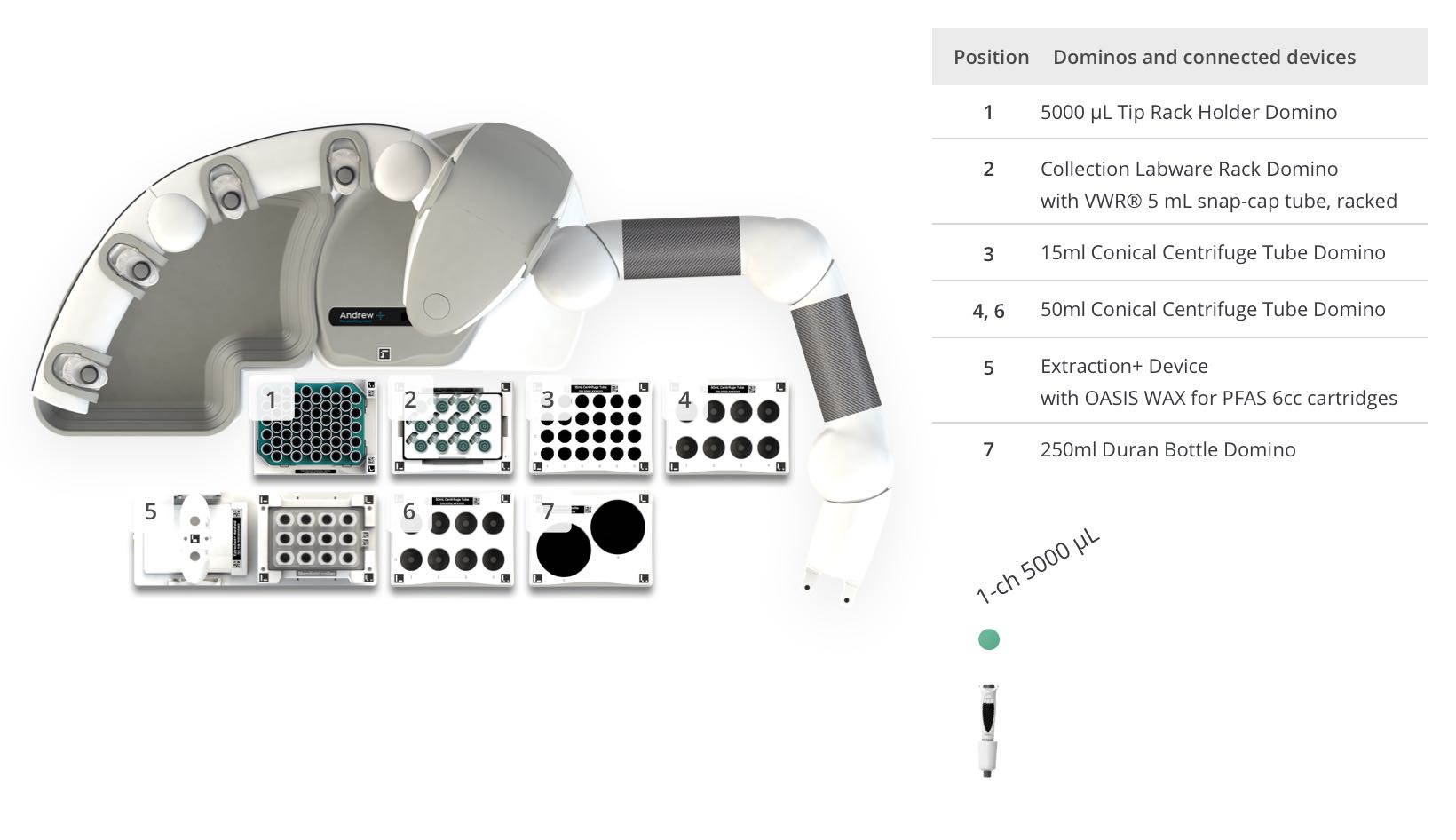 Figure 4: Andrew+ OneLab deck set up for the automated “PFAS Testing in Milk using Oasis WAX for PFAS - 12_samples” assay. Domino/Device locations on Andrew+ deck: [1] 5ml Tip Rack Holder Domino, [2] Collection Labware Rack Domino with Eppendorf® 5 mL snap-cap tube, racked, [3] 15ml Conical Centrifuge Tube Domino, [4] 50ml Conical Centrifuge Tube Domino, [5] Extraction+ Device with OASIS WAX for PFAS 6cc cartridges, [6] 50ml Conical Centrifuge Tube Domino, [7] 250ml Duran Bottle Domino