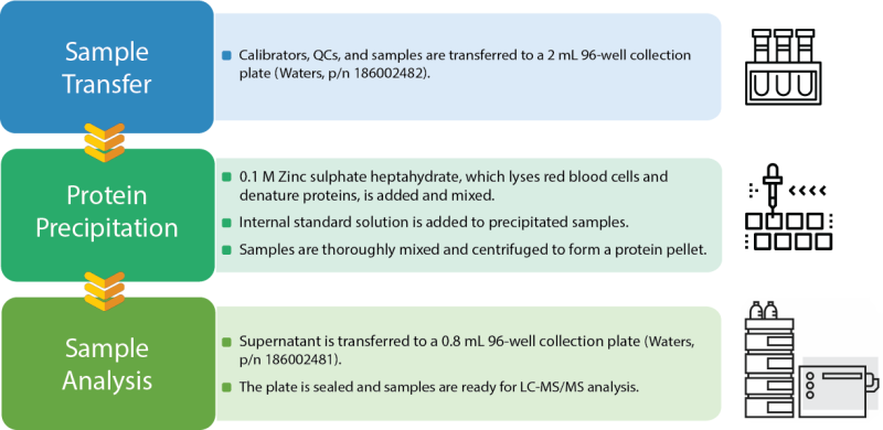 The workflow in Figure 1 describes the sample transfer and protein precipitation of whole human blood samples for the quantitation of immunosuppressants on an LC-MS/MS platform.