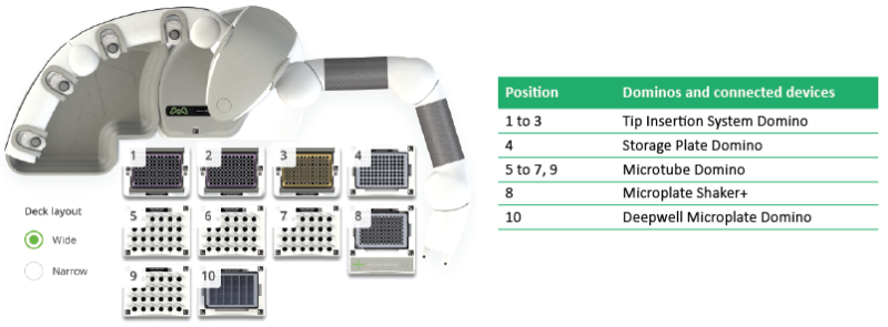 Figure 2: Andrew+ Domino configuration for the automated immunosuppressant 96-sample protocol.