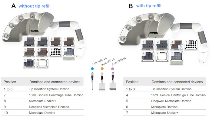 - Tip consumption | 8x 5-350 μL tips, 1x 10-1000 μL tips, and 8x 50-1200 μL tips
