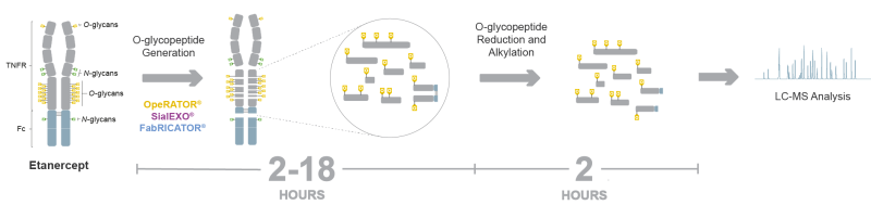 OpeRATOR digests N-terminally to Ser and Thr residues carrying a core 1 O-glycan and requires the presence of the sialidase SialEXO® to achieve the optimal activity. The digestion takes from 2 hours to around 18 hours, depending on the target protein. This assay was optimized for the biotherapeutic Etanercept but is applicable to many other heavily O-glycosylated proteins. Etanercept is a fusion protein where the extracellular domain of the TNFα receptor is linked to the Fc portion of human IgG1. The protein contains a cluster of up to 13 O-glycosylated Ser/Thr residues just above the hinge, making it a very difficult biopharmaceutical to characterize.