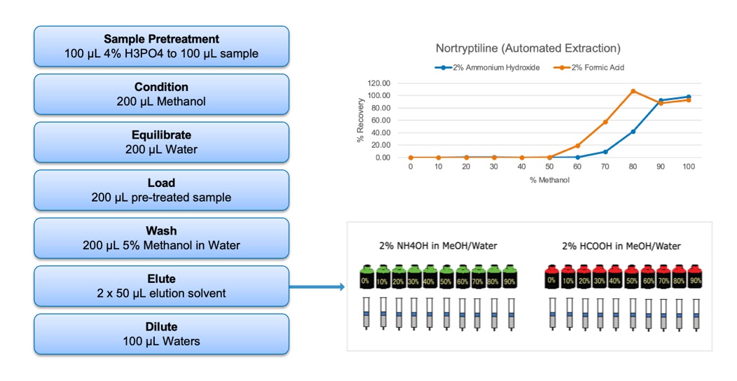 The 20-bottle SPE method optimization approach describes an elegant experimental design that varies the pH and the organic content of the elution solution to determine which condition provides the best probability of eluting the compound of interest from the sorbent bed. The elution solvent composition varies from 0-100% organic (generally methanol) with either 2% ammonium hydroxide or 2% formic acid. The acidic or basic nature of the elution solvent helps alter the pH, whereas the organic content helps dissociate analytes from the sorbent bed and improve solubility.