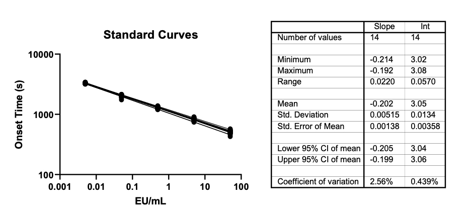 This set of data (fourteen runs) is from four days using the same lots of reagents and reference standard endotoxin. The standard curve for each plate was constructed and dispensed from a unique set of dilutions. These linear fits are log-log plots from each plate. The standards for these curves are 50, 5, 0.5, 0.05 and 0.005 EU/mL. The associated plot has all onset time replicates for each of the fourteen lines plotted (there are a total of 42 points per x-axis value).