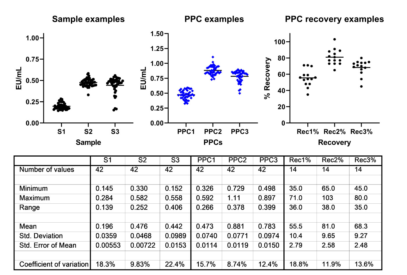 They were tested on the same plates as in Figure 1 and the EU/mL results were derived from the associated standard curve. PPCs were made by spiking each sample with the 5.0 EU/ml standard, 30 μL, added to 270 μL of sample to result in an expected 0.5 EU/mL outcome for the PPC if the original sample had no endotoxin signal and no interference or enhancement. PPC recoveries used average values (14). The recoveries suggest that these samples exhibit some form of interference. See reference 2 for more information on PPCs and recoveries. The line in the scatter plot is the mean for the set.